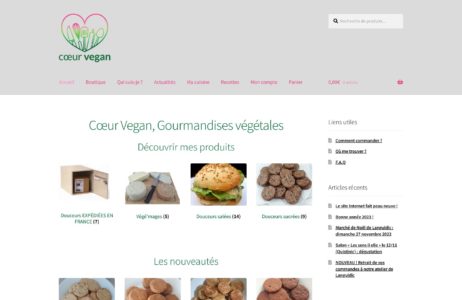 Coeur Vegan est la société d’Anaïs Baupin, qui cuisine et vend des gourmandises vegan. Elle a créé elle-même sa boutique en ligne sur WordPress et WooCommerce. Je suis intervenu sur du peaufinage pour finaliser l’ensemble :