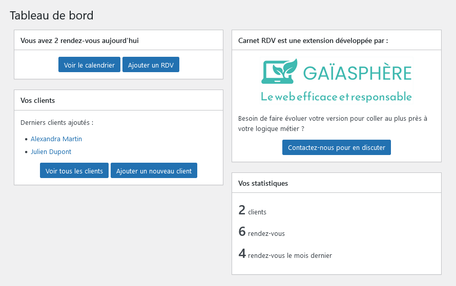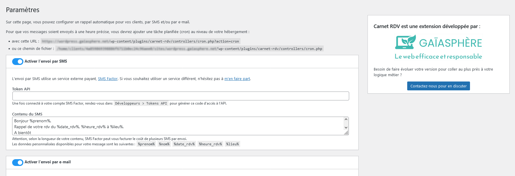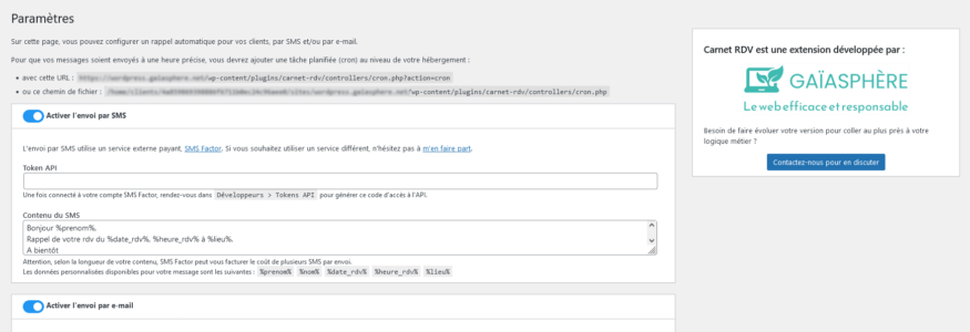 Gaïagenda est une extension WordPress destinée à la gestion d’un carnet de rendez-vous avec notifications clients par SMS ou/et e-mail.